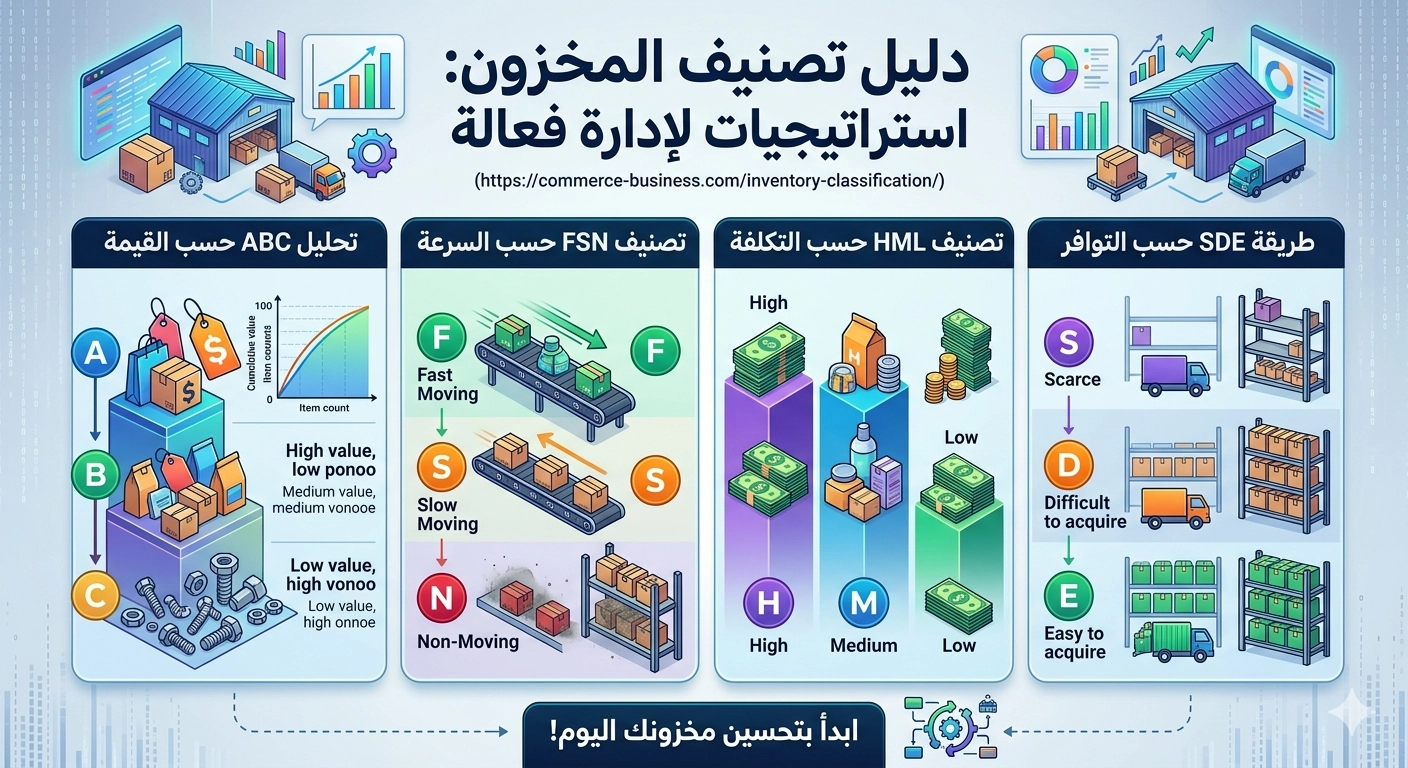 تُعد إدارة المخزون الركن الأساسي لنجاح أي مشروع تجاري أو صناعي. فبدون تصنيف دقيق، تتحول المخازن إلى “ثقوب سوداء” تبتلع السيولة وتراكم الهوالك. يوضح لك هذا الدليل منهجيات عالمية تساعدك في تنظيم بضائعك بناءً على القيمة، السرعة، التكلفة، والتوفر.
