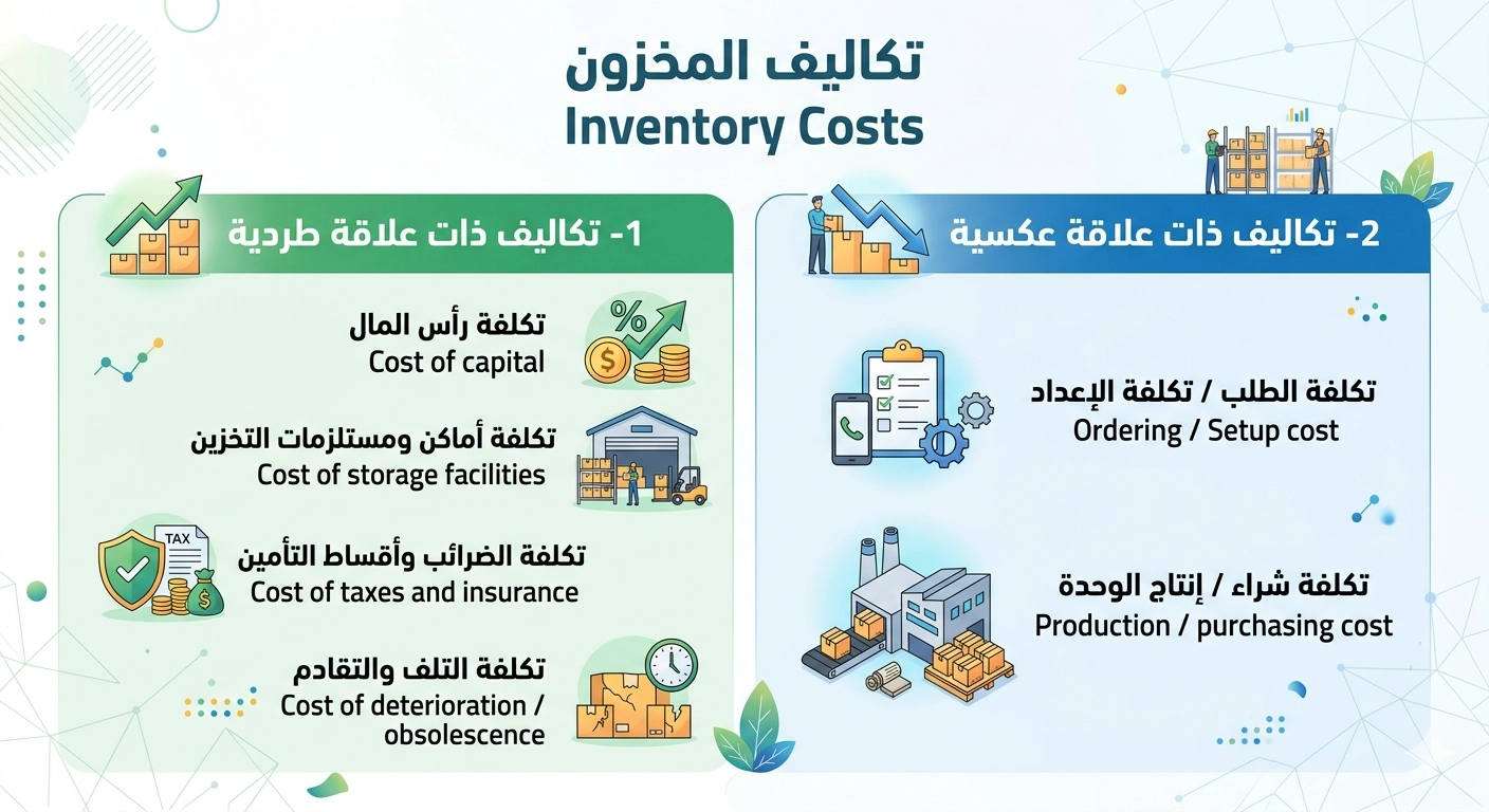 تكاليف المخزون هي جميع النفقات التي تتحملها المنشأة نتيجة الاحتفاظ بالمخزون أو طلبه أو إنتاجه، وتشمل تكلفة التخزين، تكلفة الطلب، تكلفة رأس المال، وتكلفة المبيعات المفقودة.